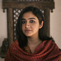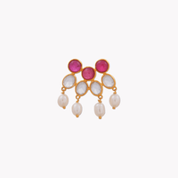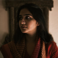 Formidable, feminine and a definite head turner. Layered intricately with rubies, white sapphires and pearls, this mookuthi sits beautifully on any nose profile, and almost becomes a part of you in no time. We absolutely adore this piece, and we hope you give it all the love it deserves. You may be overwhelmed by its size, but once worn you will inevitably fall in love with it. Taking cues from the reds in Ravi Varma's oil paintings, we picked rubies that mimic the oiliness from within.