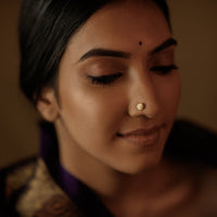 Reminding you of an era gone by, this Mookuthi is a dainty culmination of gold and diamonds, that carry within themself a sense of familiarity. It is bright, beautiful and yet so together and elegant. The intricate gold detailing competing with them diamonds will ensure that you stand out in a room of noses. This Mookuthi is the most easily styled pieces of the collection and lends itself to most nose profiles.
